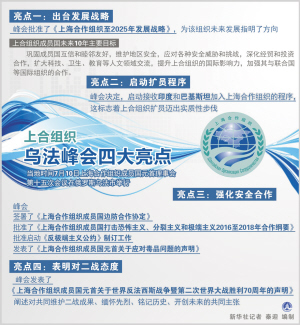 烏法,見證金磚國(guó)家新開發(fā)銀行籌備工作全面展開,應(yīng)急儲(chǔ)備安排正式啟動(dòng);見證上合組織成立14年來首次擴(kuò)員,印度和巴基斯坦加入上合組織的程序啟動(dòng),白俄羅斯成為觀察員國(guó),阿塞拜疆、亞美尼亞、柬埔寨、尼泊爾成為對(duì)話伙伴國(guó)……新興和發(fā)展中國(guó)家伙伴關(guān)系日益密切。