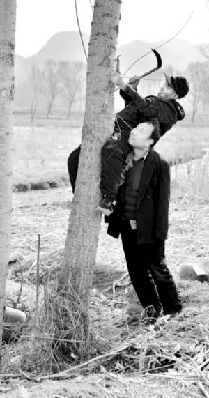 賈文其用肩膀?qū)①Z海霞頂起來,賈海霞用鐮刀將大樹多余的枝杈砍下來做樹苗。